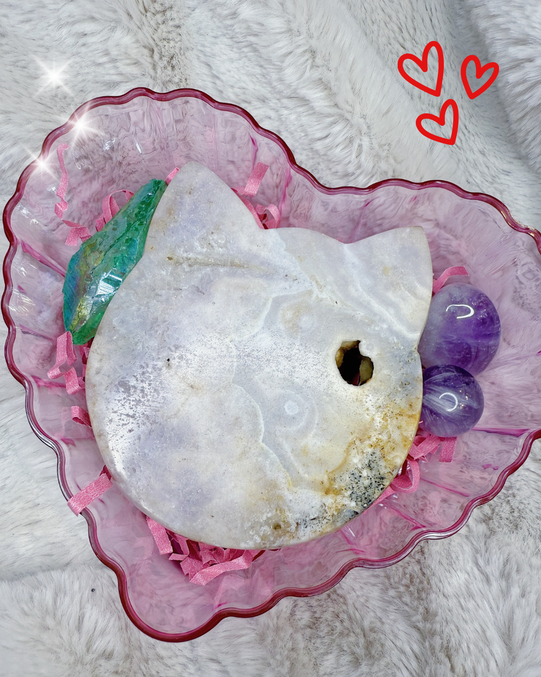 Pink amethyst cat carving, amethyst, green aura quartz piece.