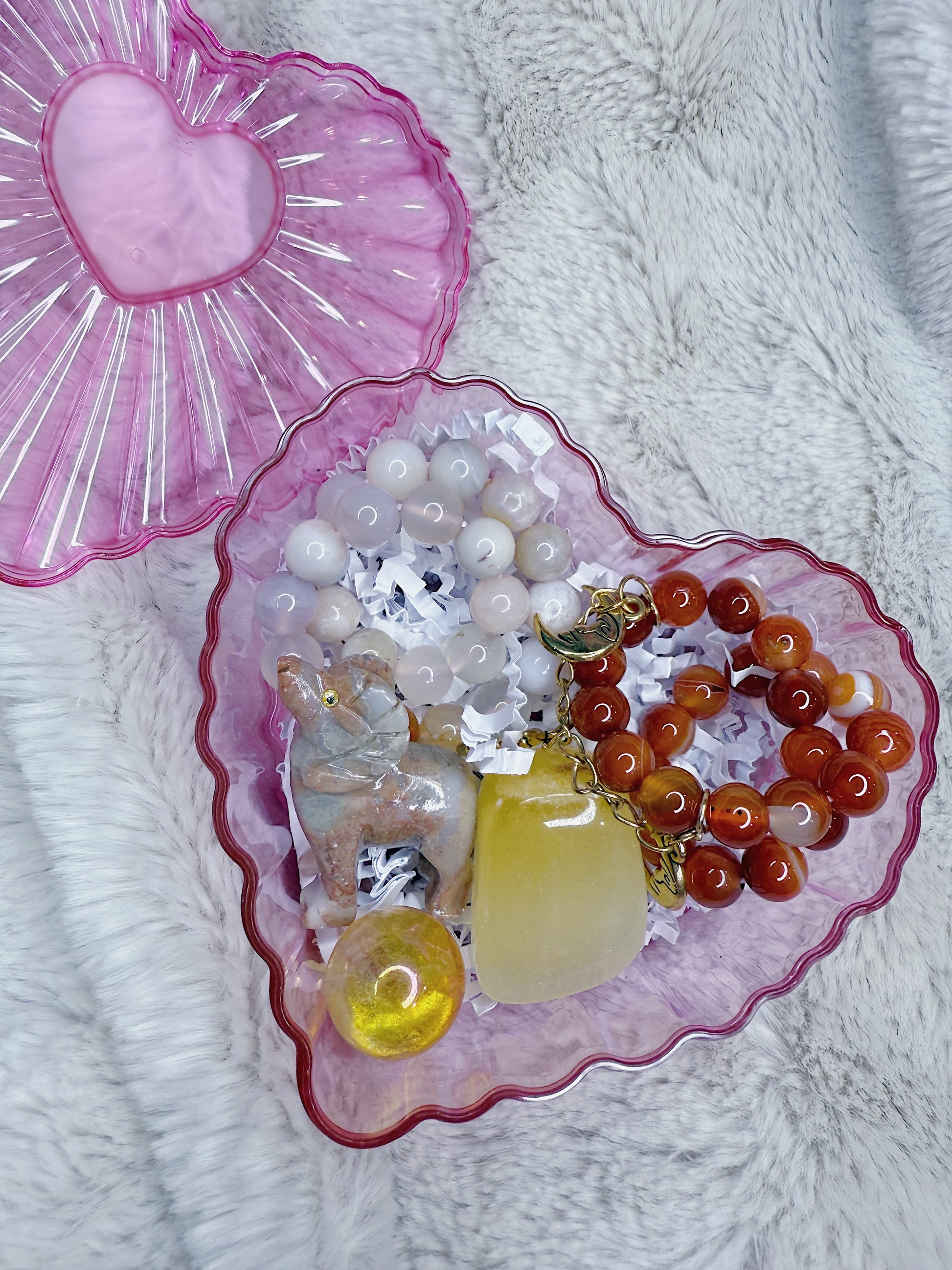 Soapstone ram, flower agate bracelet, carnelian charm moon bracelet, orange calcite, mini tangerine aura sphere.
